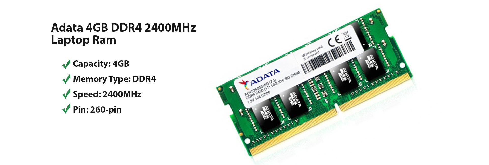 Adata 4GB DDR4 2400MHz Laptop Ram features with Capacity 4GB, Memory Type DDR4, Speed 2400MHz, Interface 260-pin, Form Factor standard 1.18" height, Standard JEDEC. This Adata 4GB DDR4 2400MHz Laptop Ram has Power supply VDD and VDDQ = 1.2V±0.06V, DRAM activation power supply VPP= 2.5V (+0.25V / -0.125V), DRAM spec/VCC DDR4 STD 1.2V. This ram also has Operating temperature 0°C to 85°C.
