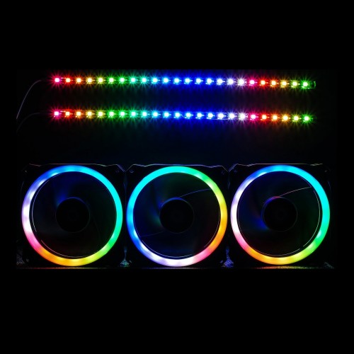 The Prizm ARGB series case fans come in 120 mm, and feature a dual-ring aperture design, which allows you to display RGB effects on both sides of the assembly. Enjoy nearly 16.8 million customized RGB colors and effects through compatibility with top-end motherboard manufacturers. Each LED bead can emit a variety of lighting colors to enrich your vision. There are up to 16.8 million colors and coordinate your own custom schemes for endless variety. Fan speed automatically adjusts according to temperature, effectively reducing system noise while achieving excellent heat dissipation. With the set of 3 fans, you are also getting 2 ARGB LED Lighting Strips and a Controller too to control the lighting system of your PC together.