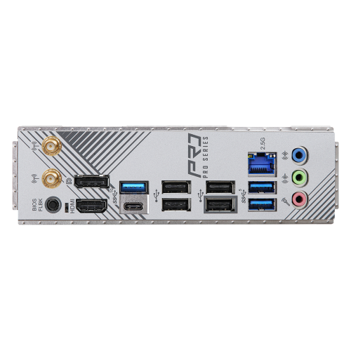 | Internal I/O Ports | - 2 x Antenna Ports - 1 x HDMI Port - 1 x DisplayPort 1.4 - 1 x USB 3.2 Gen2 Type-A Port (10 Gb/s) - 1 x USB 3.2 Gen2 Type-C Port (10 Gb/s) - 2 x USB 3.2 Gen1 Ports - 4 x USB 2.0 Ports - 1 x RJ-45 LAN Port - 1 x BIOS Flashback Button - HD Audio Jacks: Line in / Front Speaker / Microphone |