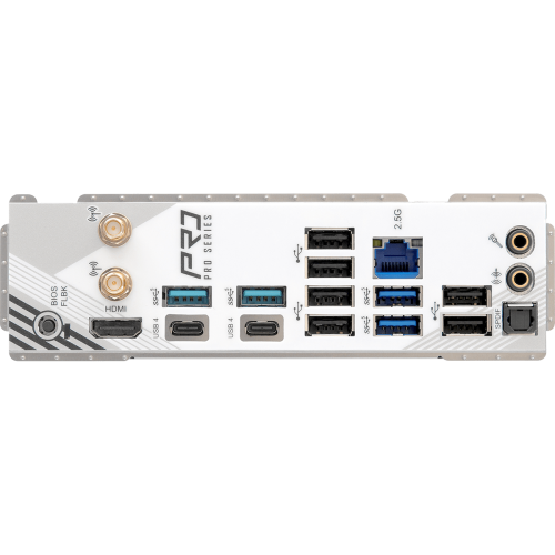 | I/O Port | - 2 x Antenna Ports - 1 x HDMI Port - 1 x Optical SPDIF Out Port - 2 x USB4 Type-C Ports (40 Gb/s)* - 3 x USB 3.2 Gen1 Type-A Ports (USB32_12 are Lightning Gaming Ports.) - 2 x USB 3.2 Gen2 Type-A Ports (10 Gb/s) (USB32_34 supports Ultra USB Power.) - 4 x USB 2.0 Ports - 1 x RJ-45 LAN Port - 1 x BIOS Flashback Button - 1 x Line Out Jack (Gold Audio Jack) - 1 x Microphone Input Jack (Gold Audio Jack) |