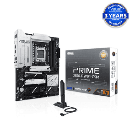 The ASUS PRIME X870-P WIFI-CSM AM5 ATX Motherboard is an advanced platform designed for users who need powerful computing performance, especially for gaming, productivity, and content creation. Equipped with the AMD X870 chipset and support for AMD Ryzen™ 9000, 8000, and 7000 series processors, this motherboard delivers superior computing power and speed. With four DIMM slots, it supports up to 192GB DDR5 RAM with overclocking speeds of 8000+MT/s, enabling smooth multitasking and gaming at high resolutions. One of the standout features of the PRIME X870-P WIFI-CSM is its extensive connectivity options. It offers a versatile set of ports, including two USB4 (40Gbps) Type-C ports for ultra-fast data transfers and display output, as well as several USB 3.2 and USB 2.0 ports, allowing you to connect multiple peripherals. The motherboard also comes with Wi-Fi 7 support, ensuring blazing-fast wireless internet speeds with low latency, and Realtek 2.5Gb Ethernet for stable wired connections, making it ideal for high-speed gaming and media streaming. For expandability, the motherboard features multiple PCIe 5.0 and PCIe 4.0 slots, enabling users to install high-performance graphics cards and other peripherals. The storage capabilities are equally robust, with four M.2 slots (including PCIe 5.0 support for ultra-fast SSDs) and two SATA 6Gb/s ports, allowing for vast and versatile storage configurations. Additional features like ASUS 5X Protection III, DIGI+ VRM, and an efficient thermal design with M.2 heatsinks ensure the system remains stable and cool under heavy loads. The inclusion of Aura Sync allows for personalized RGB lighting setups, making this motherboard not only high-performance but visually stunning. With a 3-year replacement warranty, the ASUS PRIME X870-P WIFI-CSM is a reliable and future-proof solution for any power user.