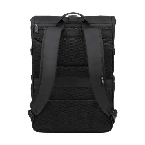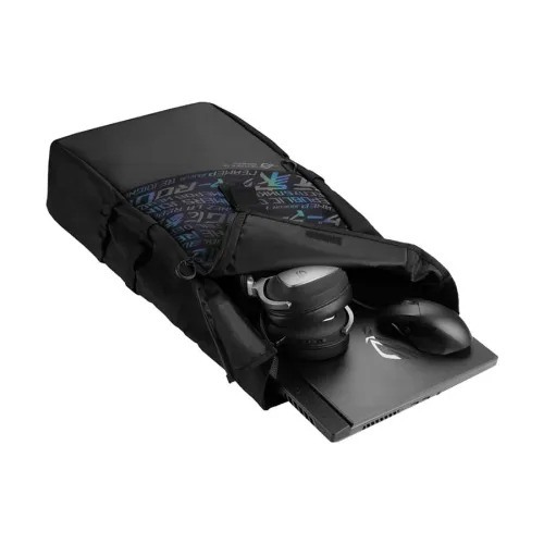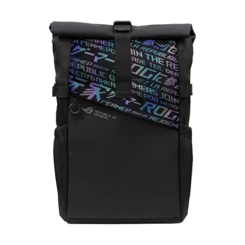 The ASUS ROG BP4701 is a gaming backpack designed to accommodate laptops up to 17 inches. It features a roll-up design for easy access and is constructed from water-resistant, high-quality fabric to withstand daily wear and tear. The backpack showcases a holographic cybertext pattern and a high-visibility reflective logo, enhancing its aesthetic appeal. Additional features include multiple interior pockets for organized storage and a luggage strap for convenient travel.