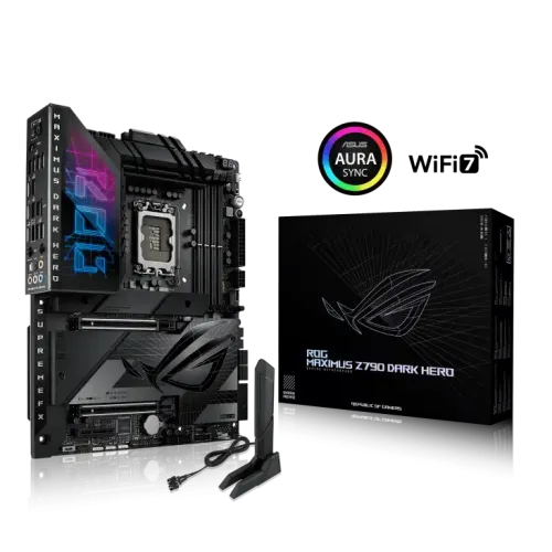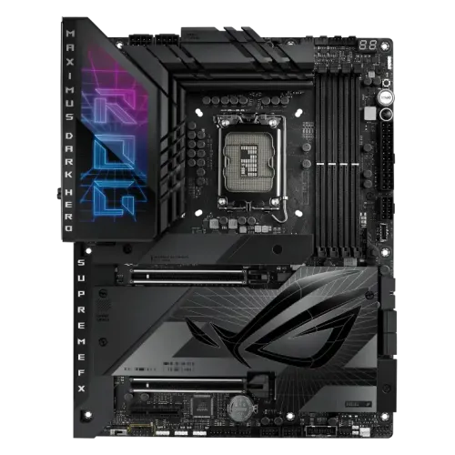 The ASUS ROG MAXIMUS Z790 DARK HERO Motherboard is an innovative motherboard developed to meet the needs of gamers and PC enthusiasts. This motherboard, which supports 14th, 13th, and 12th Generation CPUs via the LGA1700 socket, delivers a strong power solution to meet the performance needs of multi-core processors. The motherboard guarantees a steady and dependable power supply system with a 20+1+2 power stage architecture, twin ProCool II power connections, high-quality alloy chokes, and durable capacitors. This architecture is critical for unlocking the full potential of high-performance CPUs. The Motherboard features the most recent M.2 functionality, including an integrated PCIe 5.0 M.2 slot and four PCIe 4.0 M.2 slots, all of which include extensive cooling solutions. This guarantees that high-speed storage devices work optimally. The ASUS ROG MAXIMUS Z790 DARK HERO has an abundance of connectivity choices. It has dual Thunderbolt 4 USB Type-C ports, a front-panel USB 20Gbps Type-C connection with Quick Charge 4+ support (up to 60W) and USB Wattage Watcher, six additional USB 10Gbps ports, two PCIe 5.0 x16 SafeSlots, and HDMI 2.1 for high-quality video output. The motherboard includes on-board Intel Wi-Fi 7 (802.11be) for high-speed wireless connectivity as well as Intel 2.5 Gb Ethernet with ASUS LANGuard for dependable wired networking. AI Overclocking is an ASUS-exclusive feature that provides intelligent control for enhancing system performance. This function enables users to maximize the performance of their hardware without the complications of manual overclocking. The ASUS ROG MAXIMUS Z790 DARK HERO Motherboard is a feature-packed powerhouse that combines improved power delivery, storage capacities, networking choices, and intelligent control for an unrivaled gaming and computing experience.