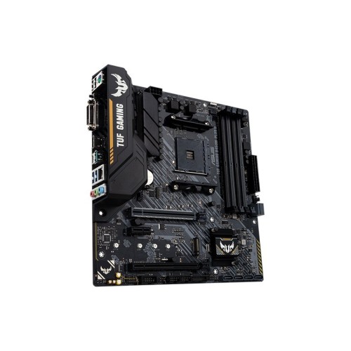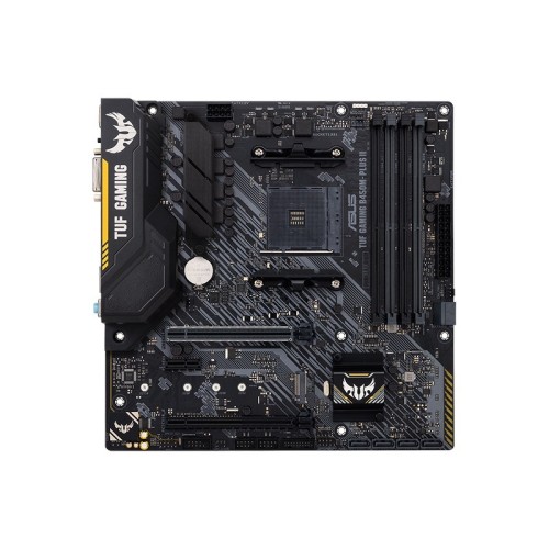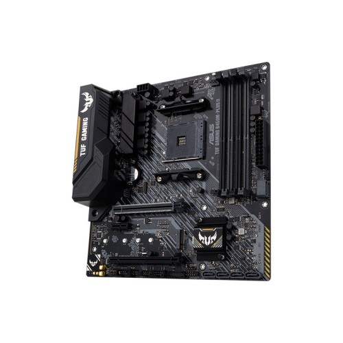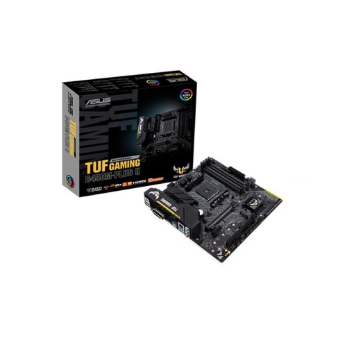 ASUS TUF Gaming B450M-PLUS II AMD Ryzen Micro-ATX Motherboard is a versatile and reliable choice for building a gaming PC. It's designed for AMD AM4 Socket processors, including Ryzen 5000 Series, 4000 G-Series, and various other models. With support for up to 128GB of DDR4 memory and dual-channel memory architecture, it ensures smooth multitasking and gaming performance. The motherboard provides robust graphics options with an HDMI and DVI-D port, as well as support for AMD 2-Way CrossFireX Technology. Storage is flexible, featuring M.2 slots and SATA 6Gb/s ports. It offers excellent audio quality with a Realtek ALC887/897 7.1 Surround Sound High Definition Audio CODEC, and ASUS exclusive software like Armoury Crate and Aura Sync for customization. The board is equipped with various ASUS TUF protections, ensuring durability, and comes with a range of I/O ports for connectivity. With its compact mATX form factor and a 3-year warranty, it's an ideal choice for budget-conscious gamers.