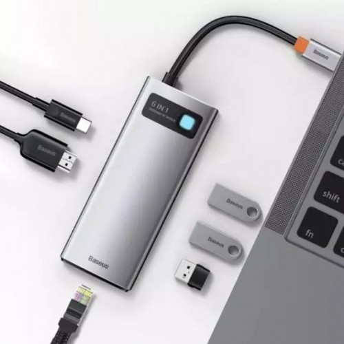 The Baseus Metal Gleam Series 6-in-1 Multifunctional Type-C HUB is a versatile and reliable accessory that allows you to expand the connectivity options of your laptop or other compatible device. With its sleek design and durable construction, this HUB provides multiple output interfaces that help you connect various peripherals, such as a mouse, keyboard, monitor, and more.One of the standout features of this HUB is its 6-in-1 design. It comes with three USB 3.0 ports, one HDMI port, one PD port, and one Ethernet port. These output interfaces allow you to connect multiple peripherals to your device simultaneously, which is especially useful if you have a laptop or other device with limited ports. For example, you can connect a monitor through the HDMI port, while also charging your device and connecting to the internet through the PD and Ethernet ports, respectively.Another important feature of this HUB is its fast charging capabilities. The PD port supports up to 5A at 20V, which is powerful enough to charge most laptops and other devices quickly. Additionally, the HUB is compatible with the BC1.2 fast charge protocol, which ensures fast charging for compatible devices.The HDMI port supports up to 4K30Hz HD resolution, providing high-quality visuals on a compatible monitor or TV. This is perfect for streaming high-quality video content, giving presentations, or working with high-resolution images. The HUB also supports fast data transfer rates of up to 5Gbps, ensuring that you can transfer large files quickly and efficiently.The HUB is made of high-quality aluminum alloy, which is both lightweight and durable. This material also provides excellent heat dissipation, ensuring that the HUB stays cool during prolonged use. The HUB is compatible with a wide range of operating systems, including Google Chrome OS, Apple OS, Windows XP/7/8/10, Linux, and Vista.