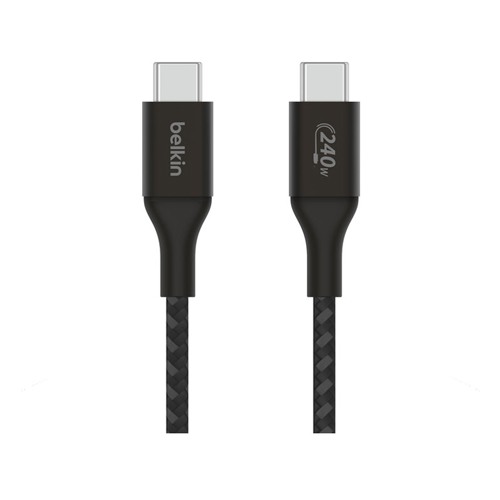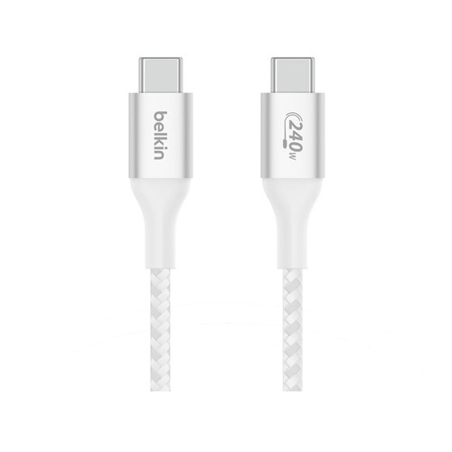 Belkin USB-C to USB-C Cable 240W, the epitome of cutting-edge technology and unparalleled performance. Engineered to meet the demands of modern users, this cable sets a new standard for fast charging and data transfer, ensuring a seamless experience for laptops, tablets, smartphones, and more. At the heart of its design lies the capability to support fast charging up to an impressive 240W. Whether you're powering up your MacBook Pro 14", tablet, or smartphone, this cable delivers unparalleled charging speeds, revolutionizing the way you stay connected and productive. With the ability to fast charge a MacBook Pro 14" from 0-50% in just 31 minutes, you'll spend less time tethered to an outlet and more time on the move, conquering your daily tasks with ease. Safety is paramount, which is why the Belkin USB-C to USB-C Cable 240W is equipped with dual E-marker chips featuring OTP (Over-Temperature Protection). These advanced safety features ensure that your devices are protected against overcharging, overheating, and other potential risks, providing peace of mind while charging. Crafted with durability in mind, this cable boasts a rugged anodized aluminum cable head and a double-braided nylon cable design tested to survive over 30,000 bends. Whether you're tossing it in your bag or stretching it across your workspace, this cable is built to withstand the rigors of daily use, ensuring reliable performance day in and day out. Certified by USB-IF to be compliant with USB 2.0 standards, this cable offers universal compatibility with a wide range of devices, including MacBook, Chromebook, iPad, and many other USB-C devices. Whether you're at home, in the office, or on the go, you can count on this cable to keep you connected to the devices that matter most. Available in 3.3 ft./1m or 6.6 ft./2m lengths, you can choose the perfect size to suit your needs, whether you prefer a compact setup or need extra reach. Plus, with 100% plastic-free packaging, you can feel good about your purchase knowing that it's environmentally friendly. In summary, the Belkin USB-C to USB-C Cable 240W is more than just a cable—it's a game-changer. Experience the ultimate in fast charging, safety, durability, and versatility, and take your charging and data transfer capabilities to new heights.