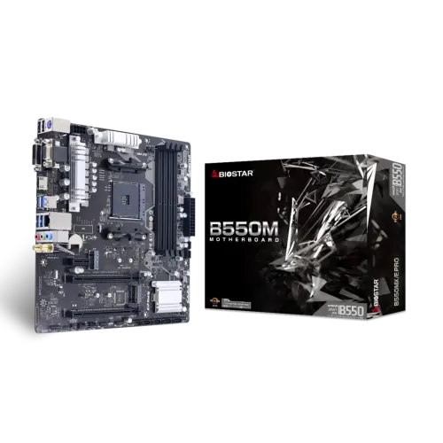 The BIOSTAR B550MX/E PRO is a high-performance micro ATX motherboard designed for AMD AM4 processors. It offers excellent compatibility and features to meet the needs of gamers, content creators, and PC enthusiasts. With its advanced specifications and cutting-edge technologies, this motherboard provides a reliable foundation for a powerful computer system. The motherboard supports both AMD Ryzen 3rd Gen (Matisse / Renoir) and 4th Gen (Vermeer) processors, ensuring compatibility with a wide range of CPUs. It utilizes the AMD B550 single-chip architecture, which enhances overall system performance and efficiency. The BIOSTAR B550MX/E PRO is its memory support. It accommodates up to four DIMM slots, supporting high-speed DDR4 memory modules with frequencies ranging from 2133MHz to an impressive 4933MHz (when overclocked). The maximum memory capacity supported is 128GB, allowing for smooth multitasking and seamless operation of memory-intensive applications. To meet the demands of fast storage solutions, the motherboard includes PCIe M.2 4.0 slots. This technology enables blazing-fast data transfer speeds of up to 64Gb/s, allowing for rapid access to files and reduced loading times for applications and games. The motherboard supports HDMI 4K resolution, ensuring a crisp and vibrant visual experience when connected to compatible displays. This feature is particularly appealing to gamers and multimedia enthusiasts who desire immersive visuals and accurate color reproduction. The BIOSTAR B550MX/E PRO offers built-in WiFi 6 module support, providing fast and reliable wireless connectivity. WiFi 6 (802.11ax) delivers higher speeds, increased network capacity, and improved efficiency compared to previous generations, enabling seamless streaming, online gaming, and file transfers. The BIOSTAR B550MX/E PRO DDR4 AMD AM4 Micro ATX Motherboard combines powerful performance, versatile connectivity options, and advanced features to deliver a superior computing experience. Whether you're a gamer, content creator, or power user, this motherboard provides the necessary tools to build a high-performing and future-proof PC system.