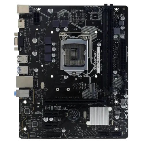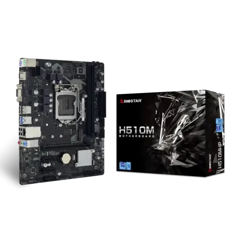 The BIOSTAR H510MHP is a micro ATX motherboard designed for 10th and 11th gen Intel Core processors. It features an Intel H510 single-chip architecture, allowing for efficient and stable performance. It offers a 5-phase VRM design with high-quality power components such as low RDS (on) Mosfet for lower temperatures and has the advantage to raise the overclocking ability. The BIOSTAR H510MHP motherboard supports 2-DIMM DDR4 memory, with speeds of up to 3200/ 2933/ 2666/ 2400/2133/ 1866 and a maximum capacity of 64 GB. It also supports PCIe 4.0 and PCIe M.2 (32Gb/s) for high-speed data transfer and storage. PCIe M.2 32Gb/s is the latest storage interface, it delivers the highest bandwidth and lower latency. It's 3 times faster compared with PCIe M.2 10Gb/s. It comes with USB 3.2 Gen1 for quick data transfer and device connectivity. The Onboard HDMI connector allows full video & audio support. It has industry-leading high-definition video quality. The BIOSTAR H510MHP motherboard provides high-quality sound with minimal loss of audio fidelity.