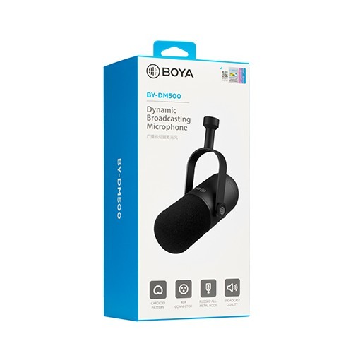 BOYA BY-DM500 is a Dynamic Broadcasting Studio Microphone from Boya. The BOYA BY-DM500 is a dynamic microphone that delivers broadcast-quality sound for vocal and instrument recording, ideal for broadcasting, podcasting, dubbing, studio recording, and more. The BY-DM500 features the combination of a dynamic cartridge and a cardioid pick-up pattern. It delivers a warm and assertive broadcast sound and rejects the unwanted background noise for perfect recordings. With a wide (20–20,000Hz) frequency response, the BY-DM500 captures more details of vocal sound and the sound of instruments, it can deliver a rich balanced sound for users. The Improved and removable foam windscreen and internal pop filter can minimize plosives, which is ideal for close-mic applications, it makes your vocal recordings to another level. The whole metal body guarantees solid construction and can resist signal interference. The BY-DM500 is incredibly easy to use. It features an adjustable mounting bracket, just attach the microphone to a microphone stand or a boom arm (not included in the packing box) through the threaded hole at the bottom, connect the microphone to an external unit with an XLR cable (not included in the packing box), then everything is ready to get started. Since it is a dynamic microphone, you don’t need batteries or 48V phantom power to support the microphone. BOYA BY-DM500 Dynamic Broadcasting Studio Microphone offers 2 years of warranty.