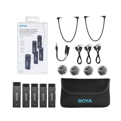 The BOYA BY-W4 wireless microphone system provides broadcast quality and dependable performance with clear, sharp sounds. It is ideal for multi-person interviews, live performances, live streaming, conferences, panel discussions, and other events because it has four channels. 4-Channel Wireless System, Surprisingly Simple to Use The BY-W4 has a wireless system that allows up to four microphones to be utilized at the same time, making it ideal for group presentations, conferences, or interviews. Excellent Audio for Broadcast The BOYA BY-W4 produces significantly more clear and more detailed audio, ensuring that your voice is heard loud and clear, thanks to a high-quality built-in omnidirectional microphone and an outstanding sensitivity of -42dB.