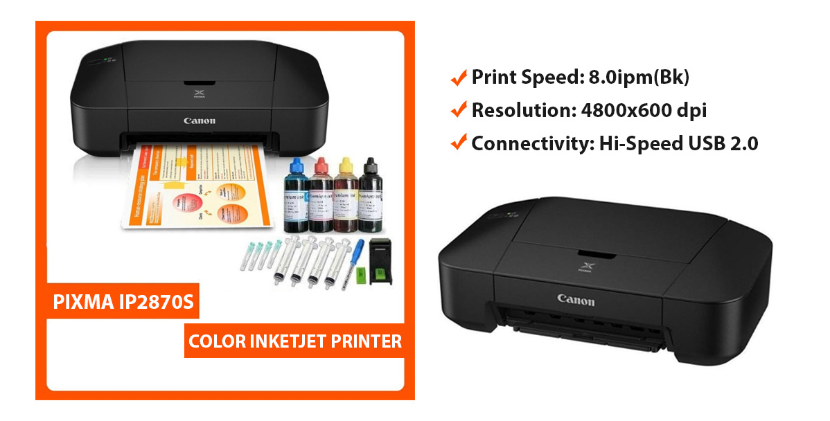Canon Pixma iP2870S has a simple and light design. Paper goes in and printed paper comes out. The low cost printer has been designed for home users, with occasional printing needs and feels a bit flaky, which is understandable and acceptable at this price point. ISO Standard print speed (A4): up to 8.0ipm (mono) / 4.0ipm (colour). Compact Design-Allow the printer to easily fit into even the smaller spaces and shelves in a home. Auto Power ON-Auto Power ON detects a print command and will automatically switch the printer on with a USB connection. Low Cost Cartridges-Affordable ink cartridges for high quality printing.