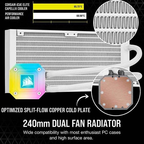 The Corsair iCUE H100i 240mm Elite Capellix Liquid CPU Cooler White delivers powerful, low-noise cooling for your CPU, with a 240mm radiator, two CORSAIR ML120 RGB PWM fans, and an ultra-bright CAPELLIX RGB pump head. The ELITE CAPELLIX cooler pump head houses 33 ultra-bright CAPELLIX RGB LEDs to go along with its RGB fans. When you add powerful, low-noise cooling to the mix, your system will look great and will run even better. An optimal cold plate design and a high-density stack of 128 micro-skived fins-per-inch provide highly efficient cooling at all loads. Delivers a flow rate of up to 0.82L/min while generating less than 20 dBA, for extreme cooling with low noise. Each ELITE CAPELLIX CPU cooler includes two separate pump caps.