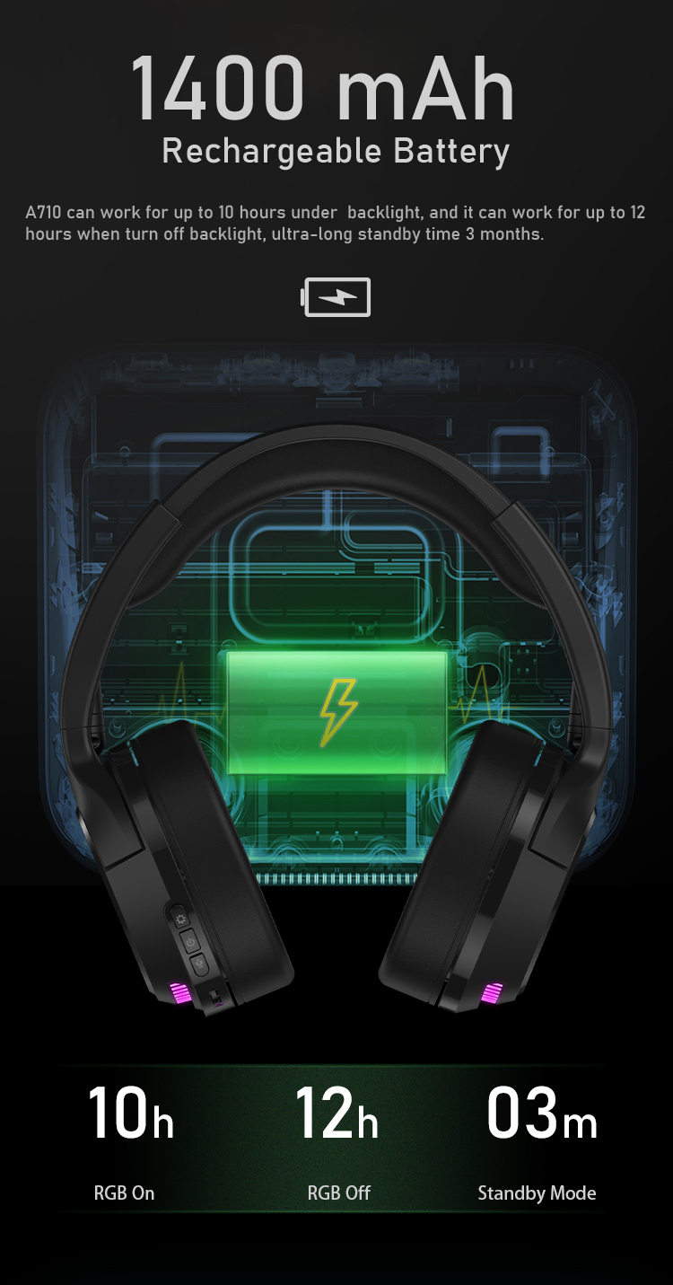 DAREU A710 Gaming Headset Can Work For Up To 10 Hours With A Backlight On And12 Hours With A Backlight Off. Standby Time Can Last As Long As Three Months.