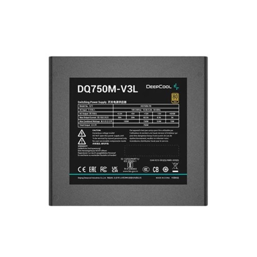 DEEPCOOL DQ750M-V3L Full Modular 750W 80 PLUS Gold Power Supply is a high-performance unit designed to cater to the demanding needs of modern PC builds. Featuring a robust 750-watt maximum load capacity, this power supply is ideal for gaming rigs and workstations that require reliable and efficient power delivery. One of the standout features of the DQ750M-V3L is its 80 PLUS Gold certification, which signifies that the unit offers approximately 90% efficiency. This high efficiency means that less power is wasted as heat, leading to lower energy costs and a reduced environmental impact. The use of full Japanese electrolytic capacitors further enhances the power supply's reliability and longevity, ensuring stable operation over extended periods. The cooling system of the DQ750M-V3L includes a 120mm fan with a Fluid Dynamic Bearing (FDB), known for its durability and quiet operation. This bearing type helps in maintaining a low noise level while ensuring effective cooling, which is critical for maintaining optimal performance and preventing overheating. Connectivity options are comprehensive, with one ATX main connector, two EPS connectors, three PCIe connectors, two SATA power connectors, and one 4-pin peripheral connector. This array of connections supports a wide range of components and peripherals, making the DQ750M-V3L a versatile choice for various system configurations. In terms of safety and regulatory compliance, the power supply boasts a suite of protections, including Over Voltage Protection (OVP), Over Power Protection (OPP), Over Current Protection (OCP), Over Temperature Protection (OTP), Short Circuit Protection (SCP), and Under Voltage Protection (UVP). These features provide peace of mind, protecting the components from electrical hazards. The power supply's technical specifications include a hold-up time of ≥16ms at 80% load and an MTBF (Mean Time Between Failures) of 100,000 hours, indicating a high level of reliability. Additionally, its compact dimensions of 150 x 140 x 86mm make it suitable for a variety of cases, especially those with limited space. Overall, the DEEPCOOL DQ750M-V3L Full Modular 750W 80 PLUS Gold Power Supply is a well-rounded choice, offering a blend of efficiency, reliability, and comprehensive connectivity options, making it a solid foundation for any high-performance computer system.