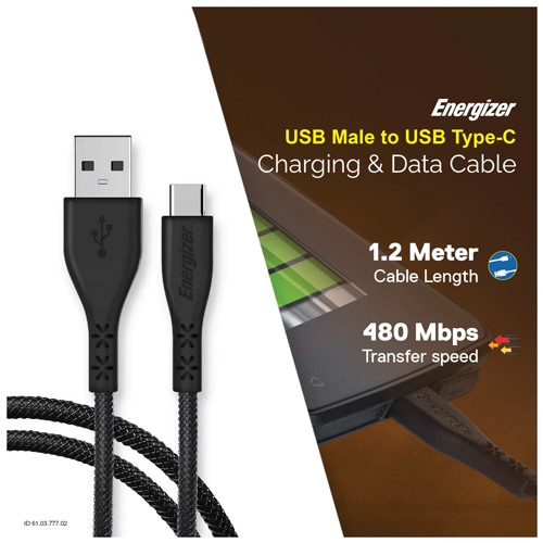 Energizer USB Male to USB Type-C charging and data cable is designed to provide reliable and efficient connectivity for a variety of devices. With a length of 1.2 meters and a sleek black color, this cable offers convenience and versatility for charging and data transfer needs. Featuring a USB-A male connector on one end and a USB Type-C male connector on the other, this cable is compatible with a wide range of devices, including smartphones, tablets, laptops, and more. Whether you need to charge your device or transfer data between devices, this cable provides a seamless and reliable connection. Built to last, the cable is constructed from tough materials that are reinforced at the main stress points, ensuring superior durability and resistance compared to regular cables. It can withstand a tension of up to 50kg and tolerate over 10,000 twists, making it ideal for everyday use and travel. The convenient length of 1.2 meters allows you to use the cable comfortably in various situations, whether you're charging your device at home, in the office, or on the go. You can easily take it with you everywhere you go, ensuring that you're always prepared to charge your devices or synchronize your data. With its robust and flexible design, this cable offers reliable performance and peace of mind. Plus, it comes with a lifetime warranty, providing additional assurance of its quality and durability. However, it's essential to note that the warranty period for this cable is 3 months, and any warranty claims must be made with the original box and all accessories. Overall, the Energizer USB Male to USB Type-C charging and data cable is a versatile and reliable accessory that offers convenience, durability, and superior performance for all your charging and data transfer needs. Whether you're at home, in the office, or on the go, this cable ensures that you stay connected and powered up whenever you need it.