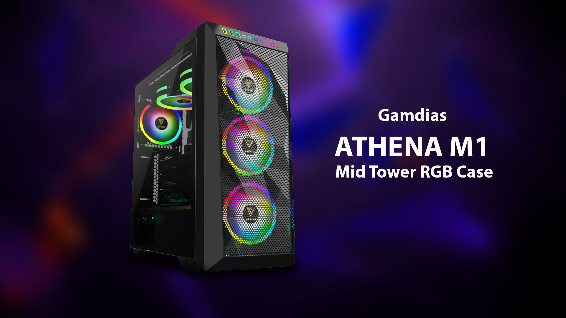 Gamdias ATHENA M1 Mid Tower RGB Case comes with Asymmetry Mesh Design which is 3 Built-in 120mm Trio Rings ARGB Fans. This casing has I/O Front Panel With ARGB, Streaming Lighting, ARGB Sync Via Motherboard, Power Cover Design, Magnetic Dust Filter, Seamless Tempered Glass Window, One Touch to Easily Switch RGB Streaming, Lighting Style, and LED off with Selectable High/Mid/Low Fan Speed. This casing is adopting a detachable asymmetry mesh and three built-in 120mm trio rings ARGB fans, ATHENA M1 provides not only an unique look but also maximum air flow through the case. The ATHENA M1 supports connection to compatible motherboards (5v 3-pin) to achieve system-wide RGB lighting synchronization, makes you easier to unite your case from chaos to calm.