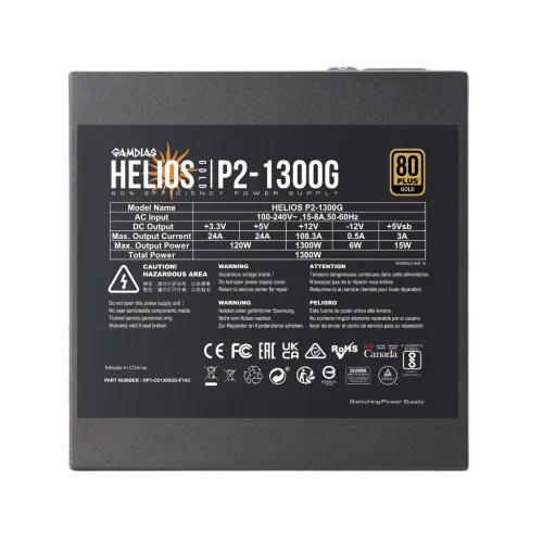 The Gamdias HELIOS P2-1300G 1300W 80 Plus Gold ATX 3.0 Power Supply is a fully modular next-generation power supply unit with 80 Plus Gold certification, ATX 3.0 and PCIe Gen 5.0 support, 100% highly reliable Japanese capacitors, and a 135mm dual-ball bearing fan for maximum stability, reliability, and performance. With a steady power output of up to 92% efficiency at 50% load and an 80 PLUS Gold level of design, this device lowers power consumption and its carbon footprint. With up to 200% total power excursion, the Gamdias HELIOS P2-1300G 1300W 80 Plus Gold Power Supply is engineered to meet ATX 3.0 standards and PCIe Gen 5.0 connection compatibility. Up to twice the overall power excursion and up to three times the GPU power excursion can be supported by the Gamdias ATX 3.0 Power Supply. For PCIe 5.0 graphics cards, the native 16 PIN (12VHPWR) PCIe connector can give up to 600W, offering strong and reliable performance and enabling the PSU to handle high-power GPUs natively. With a premium 135mm twin ball bearing fan that offers superior durability, acoustics, and thermal performance to extend the life of the PSU. In addition, the smart fan reduces unwanted noise and modifies the fan speed. The Gamdias HELIOS P2-1300G 1300W Power Supply has the best power stability and exceptional endurance thanks to 100% premium Japanese electrolytic capacitors rated at 105°C/221°F. Featuring a complete bridge LLC resonance aid, 12V synchronous rectification, and a superior DC-to-DC construction, this device produces an output that is both safe and steady. Designed to accommodate modern NVIDIA and AMD graphics cards with higher power requirements and distinct connectors, the Gamdias HELIOS P2-1300G 1300W 80 Plus Gold ATX 3.0 Power Supply can also accept up to four 6+2-pin VGA power connectors and a 12+4-pin VGA power connector (12VHPWR).