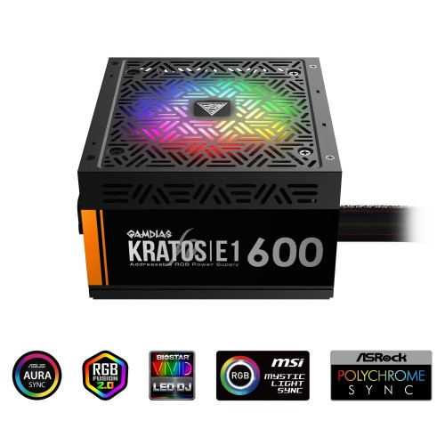 Converting less heat and being more power-efficient, the KRATOS E1-600 delivers up to 80% energy efficiency and supports C6/C7 power state. Accordingly, a deeper lower power sleep states for further efficiency is achieved. KRATOS E1-600 offers unparalleled lighting effects. By pressing one button for 3 seconds, the lighting can be easily switched between motherboard manufacture sync and the built-in 30 lighting effects, Multi-color, and LED off. With RGB motherboard sync (5V 3-pin connection), addressable RGB lighting can be synchronized via motherboard manufacture software creating a consistent style throughout your computer. KRATOS E1-600 offers you 80% energy efficiency supplying stable power while operating at lower sound levels. With built-in RGB lighting effects and addressable LEDs, effortlessly gives this power supply a unique style of its own.