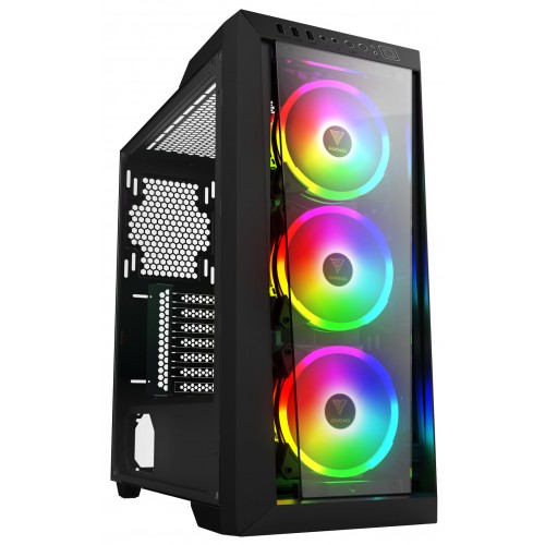 Gamdias TALOS M1 LITE Mid Tower RGB PC Case is comes with Trapezoidal Tempered Glass Panel, 3 Built-in 120mm Trio Rings ARGB Fans, Seamless Tempered Glass Window. This casing also support RGB Motherboard Sync Software. ThisGamdias case designed with Power Cover Design, Magnetic Dust Filter and One Touch to Easily Switch RGB Streaming Lighting Style, and LED off. The TALOS M1 LITE designed with a trapezoidal tempered glass and three built-in 120mm trio rings ARGB fans to allow high air flow through the aggressive angled slots. It has Seamless Tempered Glass that is build a minimalistic style, the side tempered glass is inserted from the back of case, leaving thumb screws to hold the tempered glass in place. A cleaner design displaying the internal components of the PC. The case is building upon inner beauty of the case, a vented power supply shroud at the bottom of the case surrounds the PSU with cutouts displaying the side of the PSU. In this casing, the Magnetic Dust Filter held dust filter, located on top of the TALOS M1 LITE to minimize dust entering the case. With magnets holding the filter to the case, makes it easy to remove and clean the washable dust filter. This gaming casing is comes with a single easy push button, controls 3 ARGB fans, cycling though the different effects and LED off. Another button controls the fan to high, mid with low speed. In this casing, the mid tower case comes with front trapezoidal tempered glass panel and three eye-catching RGB lighting trio ring fans and also One Touch to Easily Switch RGB Streaming Lighting Style, and LED off.