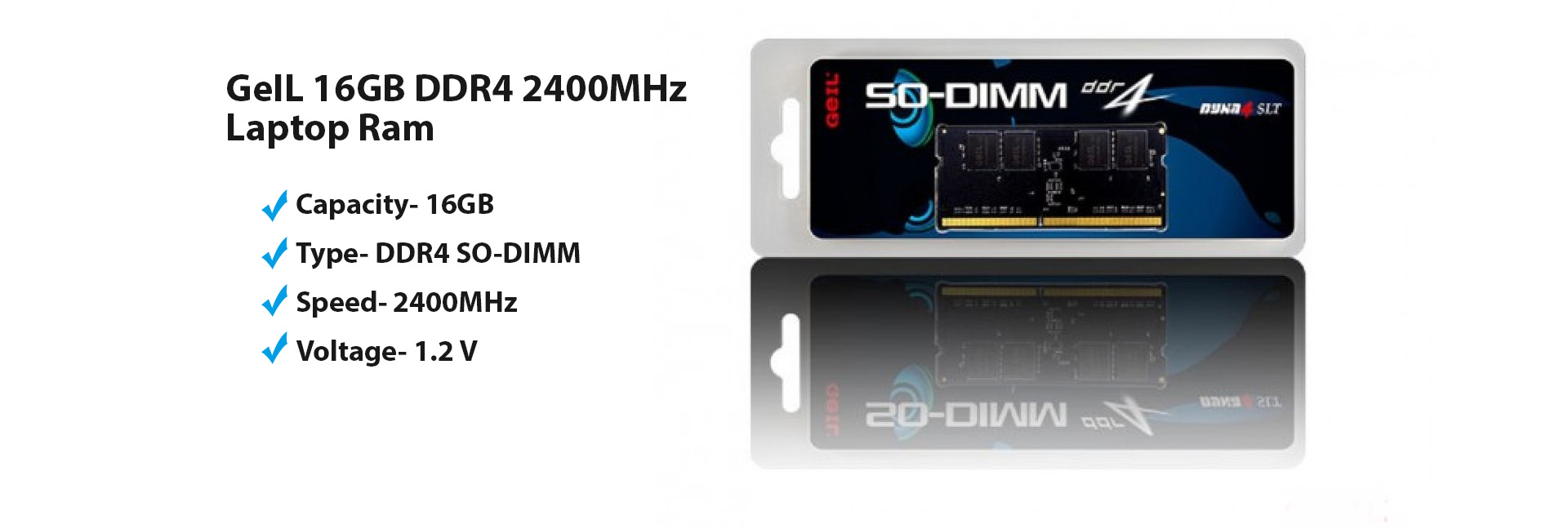 GeIL 16GB DDR4 2400MHz Laptop Ram is featured with Capacity 16GB, Type- DDR4 SO-DIMM, Speed- 2400MHz (PC4-19200), Latency Timings- 17-17-17-39. This GeIL 16GB DDR4 2400MHz Laptop Ram support 1.2 V Voltage.