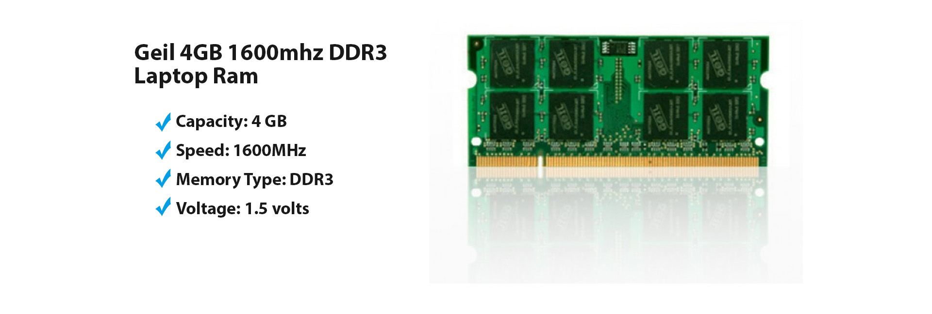 Geil 4GB 1600mhz DDR3 Laptop Ram is featured with Capacity: 4 GB, Speed: 1600MHz, Upgrade Type: Generic, Product Dimensions: 21 x 13 x 2.5 cm, Computer Memory Type: PC3 12800 DDR3 Green SO-DIMM. Geil 4GB 1600mhz DDR3 Laptop Ram Support 1.5 volts Voltage.