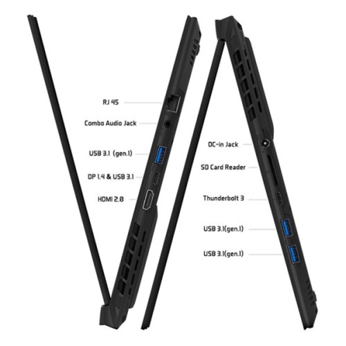 | Ports & Connectors | 3x USB 3.1 Gen1 (Type-A); 1x Thunderbolt™ 3 (USB Type-C); 1x HDMI 2.0; 1x DP 1.4 & USB3.1 (USB Type-C); 1x 3.5mm Headphone/Microphone Combo Jack; 1x UHS-II SD Card Reader; 1x DC-In Jack; 1x RJ-45 | |