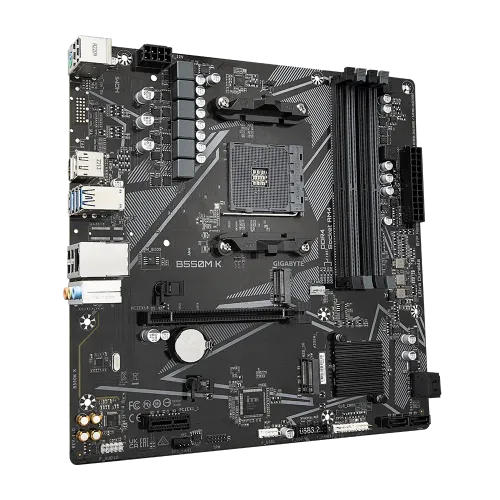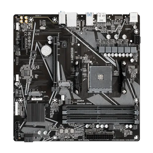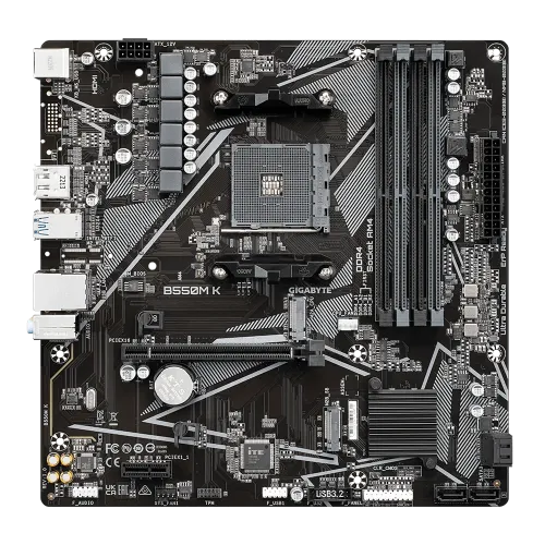 The Gigabyte B550M K is an AMD B550 Ultra Durable Motherboard designed with a digital VRM solution and advanced features for a seamless computing experience. It boasts a PCIe 4.0 x16 slot, providing high-speed data transfer for demanding applications. The motherboard supports a wide range of AMD processors, including Ryzen 5000 Series, Ryzen 5000 G-Series, Ryzen 4000 G-Series, and Ryzen 3000 Series Processors. With support for dual-channel ECC/Non-ECC unbuffered DDR4 memory (4 DIMMs), it ensures efficient and stable system performance. The Gigabyte B550M K Motherboard is PCIe 4.0 ready, offering an ultra-fast x16 slot for graphics cards. Additionally, it features dual ultra-fast NVMe PCIe 4.0/3.0 M.2 connectors, providing lightning-fast storage options. To deliver exceptional audio quality, the Gigabyte B550M K is equipped with high-quality audio capacitors and audio noise guard. It also features a GbE LAN with bandwidth management for efficient networking, rear DisplayPort and HDMI support for multi-display setups, and Smart Fan 5 with FAN STOP technology. An anti-sulfur resistor design is also incorporated into the motherboard to increase its reliability and durability. The Gigabyte B550M K is a great option for assembling a potent and effective micro ATX system powered by AMD.