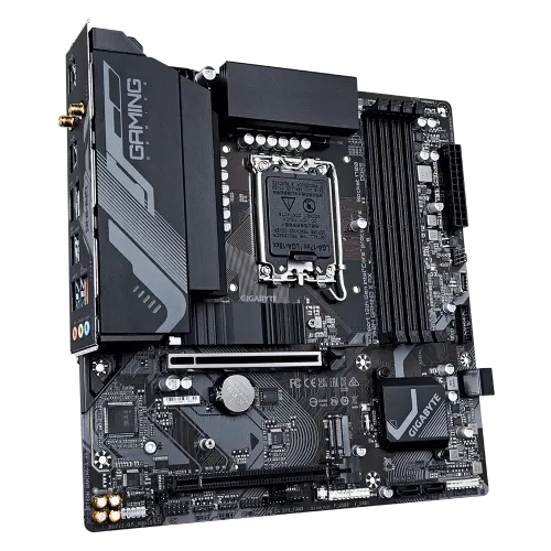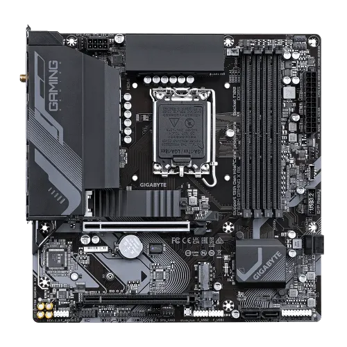 The GIGABYTE B760M GAMING X AX is a high-performance motherboard designed for gaming enthusiasts and power users. It supports both 14th, 13th and 12th-generation Intel processors with its LGA 1700 socket, ensuring compatibility with the latest CPU technologies. This 14th Gen Motherboard is its Hybrid 8+1+1 Phases Digital VRM solution, which provides exceptional power delivery and stability for optimal performance. This ensures that the motherboard can handle demanding tasks and overclocking without any issues. The motherboard supports Dual Channel DDR5 memory, allowing for faster data transfer rates and improved multitasking capabilities. With four DIMM slots and XMP memory module support, users can easily install and configure high-speed RAM for smooth and responsive system performance. The GIGABYTE B760M GAMING X AX motherboard. It features two PCIe 4.0 x4 M.2 connectors, enabling lightning-fast storage solutions. Additionally, the motherboard incorporates an advanced thermal design and M.2 Thermal Guard to maintain VRM power stability and optimize M.2 SSD performance, preventing thermal throttling and ensuring reliable operation. The EZ-Latch feature of the PCIe 4.0x16 slot allows for easy installation and removal of graphics cards, making it convenient for users who frequently upgrade their GPUs. The motherboard also offers fast networking capabilities with 2.5GbE LAN and Wi-Fi 6E 802.11ax support, ensuring low latency and high-speed connectivity for online gaming and other network-intensive tasks. The GIGABYTE B760M GAMING X AX provides a front USB-C® port with a 10Gb/s transfer speed, as well as DisplayPort (DP) and HDMI ports for multiple display setups. This allows users to connect various peripherals and external devices with ease. The Smart Fan 6 feature is designed to keep the system cool and quiet. It includes multiple temperature sensors and hybrid fan headers with FAN STOP technology, enabling precise control over fan speeds and optimizing cooling performance while minimizing noise levels. The Q-Flash Plus, allows users to update the motherboard's BIOS firmware without the need to install the CPU, memory, and graphics card. This feature provides a convenient and hassle-free method for keeping the system up to date with the latest firmware releases. The GIGABYTE B760M GAMING X AX DDR5 motherboard offers a comprehensive range of features and technologies for gamers and power users seeking exceptional performance, reliable connectivity, and convenient upgradability.