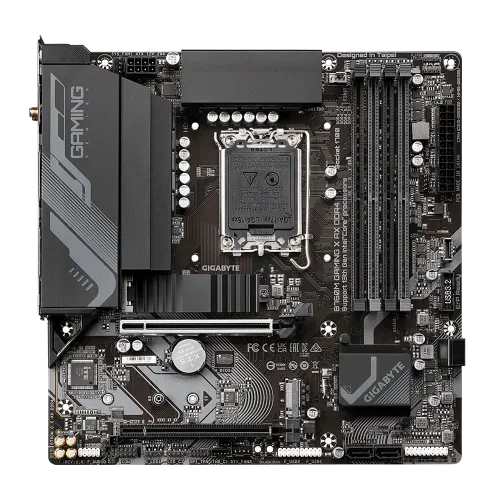 The GIGABYTE B760M GAMING X DDR4 is an mATX motherboard built for Intel CPUs from the 13th and 12th generations. It offers an 8+1+1 phase hybrid digital VRM technology for unrivaled performance, dual channel DDR4 compatibility with 4 DIMMs, and next-generation storage with two PCIe 4.0 x4 M.2 ports. M.2 Thermal Guard and improved thermal design assure VRM power stability and M.2 SSD performance. The 14th Gen Motherboard has an EZ-Latch PCIe 4.0x16 slot with a quick-release design, a fast 2.5GbE LAN, and enhanced connection choices such as front USB-C 10Gb/s, DP, and HDMI. Multiple temperature sensors and hybrid fan headers with fan stops are included in the Smart Fan 6 technology. The Q-Flash Plus function enables simple BIOS updates without the need to install the CPU, RAM, or graphics card.