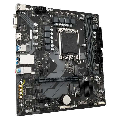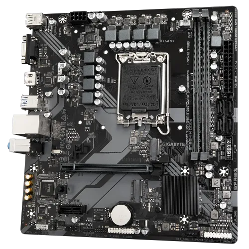 The GIGABYTE B760M H DDR4 mATX Motherboard is designed for Intel Socket LGA 1700 and supports 14th, 13th, and 12th Generation Series Processors. The motherboard's Hybrid 6+1+1 Phases Digital VRM Solution provides unrivaled performance for dependable computing. The Dual Channel DDR4 with 2 DIMMs supports the XMP Memory Module for greater memory capacities. The motherboard has two PCIe 4.0 x4 M.2 connectors for storage, ensuring compatibility with next-generation storage devices. The 14th Gen Motherboard includes an EZ-Latch PCIe 4.0 x16 Slot with a Quick Release Design for easy hardware installation. It also offers dependable network connectivity with GbE LAN and expanded connectivity possibilities with HDMI and D-Sub connectors. The Smart Fan 6 technology improves cooling performance even further by using numerous temperature sensors and hybrid fan headers with FAN STOP functionality, making the GIGABYTE B760M H DDR4 mATX Motherboard a reliable and effective alternative for a variety of computing applications.