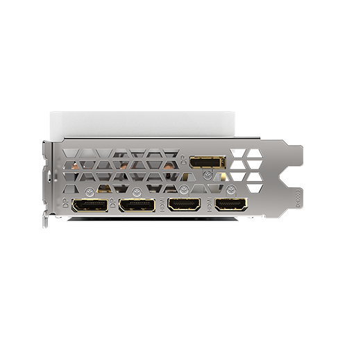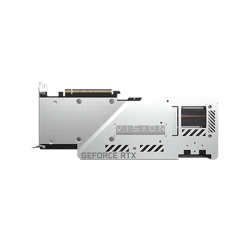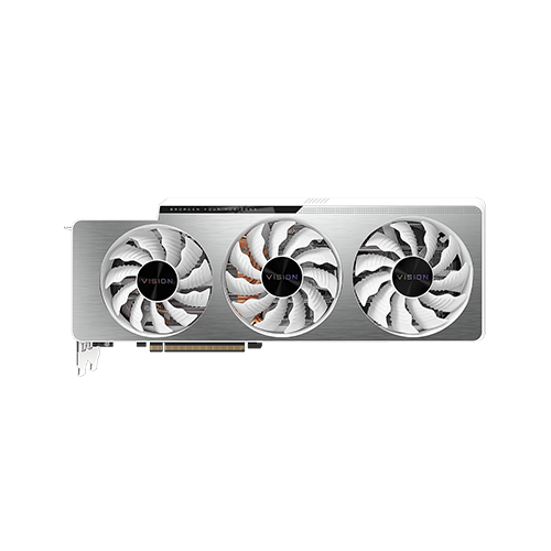 The Gigabyte RTX 3080 Ti VISION OC Graphics Card From Gigabyte. the Gigabyte RTX 3080 Ti VISION OC Graphics Card brings the power of real-time ray tracing and AI to your PC games. The Ampere architecture features 2nd Gen RT Cores and 3rd Gen Tensor Cores. The GPU features 12GB of GDDR6X VRAM and a 384-bit memory interface, offering improved performance and power efficiency over the previous Turing-based generation. The front panel of the card features a variety of outputs, such as DisplayPort 1.4a and HDMI 2.1. HDMI 2.1 supports up to 48 Gb/s bandwidth and a range of higher resolutions and refresh rates, including 8K @ 60fps, 4K @ 120fps, and even up to 10K. The RTX 3080 Ti is not just about high-resolution gaming. Computationally intensive programs can utilize the GPU's 10240 cores to accelerate tasks using CUDA and other APIs.For cooling, Gigabyte implemented the WINDFORCE 3X cooling system. It features two 90mm fans and one 80mm fan. The fans feature unique blades, where the airflow is split by the triangular fan edge, and guided smoothly through the 3D stripe curve on the fan surface. With alternate spinning, the fans reduce turbulence and increase air pressure. The 3D Active Fan provides semi-passive cooling and the fans will turn off when the GPU is in a low load or low power state. There is also seven composite copper heat pipes and a large copper plate with direct contact to the GPU and VRAM, which efficiently transfer heat. The extended heatsink design allows air flow to pass through, providing better heat dissipation. It also has RGB Fusion 2.0, which has 16.7 million customizable color options and a variety of lighting effects. You can also use it to synchronize with other AORUS devices.