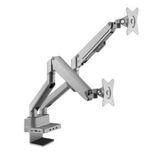 The Lenovo Services AM220 GR Double Monitor Arm is a sophisticated, full-motion mounting solution for users who rely on a dual-screen workspace. The "GR" likely stands for Grey, Graphite, or Silver, indicating the aesthetic finish, which is the main difference from the AM220 BK (Black) model. Enhanced Ergonomics and SpaceDesigned to clamp securely to the edge of a desk, the AM220 GR immediately frees up valuable desktop real estate that would otherwise be consumed by two monitor stands. Its primary benefit is providing superior ergonomic positioning for both displays, allowing users to reduce eye, neck, and back strain through effortless adjustment.Superior AdjustabilityAs a professional dual arm, it offers extensive flexibility:Dynamic Adjustment: The arm is built around advanced motion technology (often patented, like Ergotron's Constant Force, which Lenovo frequently rebrands) for smooth, spring-assisted height, depth, and angle adjustments without the need for tools.Independent Articulation: Each of the two monitors can be moved independently to perfectly align side-by-side.Rotation: Users can easily rotate each screen $\pm 180^{\circ}$ (or $360^{\circ}$ in some high-end models) to switch from landscape to portrait mode—ideal for coding, document comparison, or graphic design.Hinged Bow: The design often includes a hinged bow to allow monitors to pan left or right independently, ensuring optimal screen sharing or perfect alignment in a corner desk setup.Technical CapacityThe AM220 GR is built with durable steel and aluminum. It typically supports:Monitor Size: Two monitors up to approximately 30–32 inches when placed side-by-side.Weight Capacity: It can safely support up to $19.8 \text{ lb}$ (or $9 \text{ kg}$) per arm, accommodating most professional and gaming displays.Mounting: It features the universal VESA standard ($75 \text{mm} \times 75 \text{mm}$ and $100 \text{mm} \times 100 \text{mm}$) and provides both C-clamp and grommet mounting for versatility.The AM220 GR ensures a clean, highly functional, and comfortable dual-monitor setup.