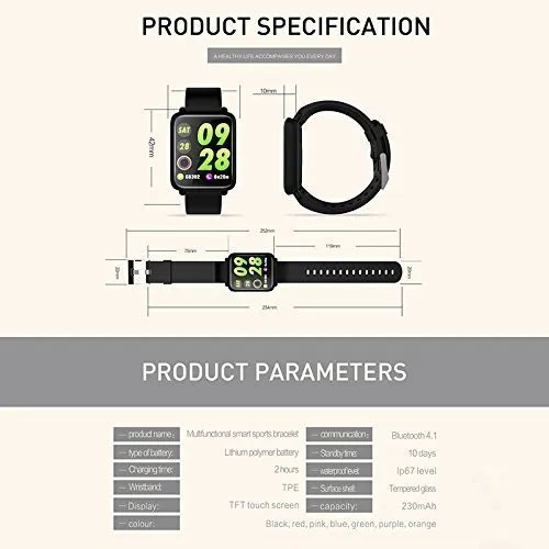 | Others | Waterproof: IP67 CPU: NRF52832 QFAA Languages: Firmware: English,Chinese,Korean,Spanish,Japanese,French, German,Russian,Arabic,Ukrainian App: English,Chinese Simple,Chinese traditional,English, German,Spanish,Japanese,French, Italian,Russian,Arabic, Portuguese,Ukrainian Package Contents: 1 X Smart Watch 1 X USB Cable 1 X User manual |