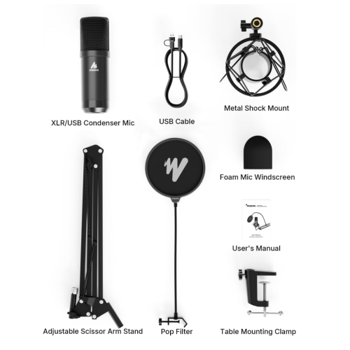 | Others | Adjustable Scissor Arm Stand Includes a sturdy, flexible stand for easy positioning and vibration isolation during recording sessions. Shock Mount System Reduces handling noise and mechanical vibrations for smoother, stable sound performance. Advanced Software Control Compatible with various audio editing and recording software for enhanced sound customization. Versatile Use: Ideal for podcasting, voice-overs, streaming, recording vocals, gaming, and professional studio setups. |