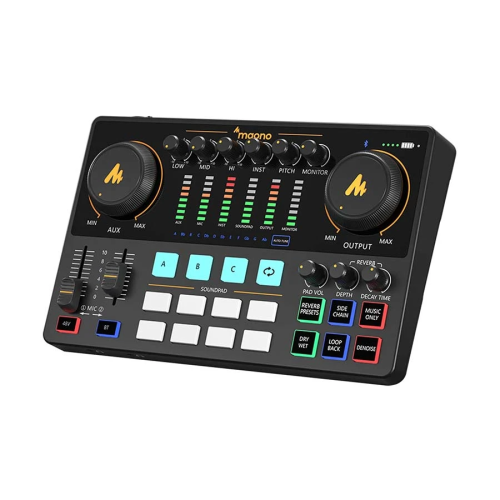 The console is packed with creative tools to enhance your content. It includes 11 customizable sound pads for playing jingles, sound effects, or background music. Additionally, it offers a suite of voice effects, including multiple reverb modes, 12-step auto-tune, and customizable tone controls (treble, mid-range, bass). For live applications, it provides professional features such as independent volume controls for each input, a DENOISE function to reduce background noise, and a loopback switch for playing computer audio through your stream.