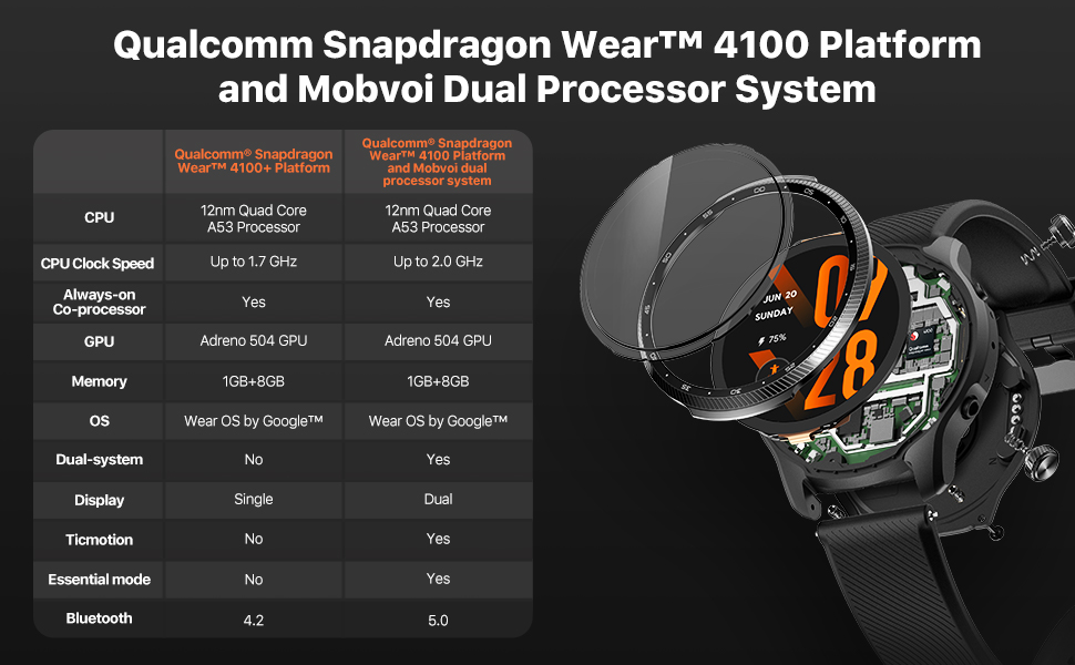 Updated Chipset, Better Experience : Wear OS by Google Ticwatch Pro 3 ultra GPS smartwatch with the Qualcomm Snapdragon Wear 4100 Platform and Mobvoi Dual Processor System. Deliver faster and smoother performance and connectivity. 1G RAM and 8G ROM Memory. NFC payment supports Google Pay.