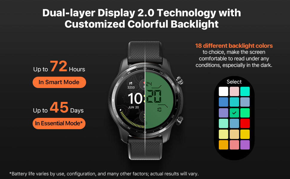 Long Battery Life : Dual layers display 2.0 technology keeps Ticwatch Pro 3 Ultra GPS smartwatch going up to 72 hours in Smart Mode and 45 days in Essential mode. The new customizable backlight offers you better visual enjoyment, makes the screen comfortable to read under any conditions, especially in the dark.