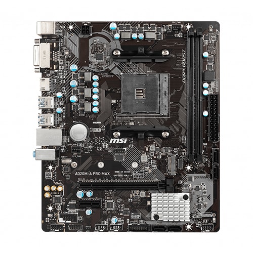 The MSI A320M-A PRO MAX AM4 is a high-quality micro-ATX gaming motherboard designed to support the 1st, 2nd, and 3rd generation AMD Ryzen processors along with Ryzen processors with Radeon Vega Graphics and Athlon processors with Radeon Vega Graphics. This feature-packed motherboard delivers reliable performance and versatile connectivity options, making it an ideal choice for gamers and PC enthusiasts.The motherboard is built with the AMD A320 chipset, which ensures stable and efficient performance. Its micro-ATX form factor measures 9.3 inches by 7.9 inches, making it suitable for compact gaming builds without compromising on essential features.When it comes to audio, the motherboard boasts a 7.1-channel high-definition audio solution, providing an immersive and crystal-clear sound experience for gaming, movies, and music.Memory support on the A320M-A PRO MAX is exceptional. It features a dual-channel memory architecture, allowing for better data transfer rates and overall system responsiveness. The motherboard supports DDR4 memory with speeds ranging from 1866MHz to an impressive 3200MHz (by JEDEC), and with A-XMP OC mode enabled, it can reach speeds up to 3200MHz. The maximum memory capacity supported is 32GB, providing ample room for multitasking and memory-intensive applications.In terms of graphics capabilities, the motherboard offers a DVI-D port and an HDMI 1.4 port, supporting resolutions up to 1920x1200@60Hz and 4096x2160@24Hz, respectively. The graphics performance can be further enhanced using processors with Radeon Graphics, and it supports a maximum shared memory of 2048MB.