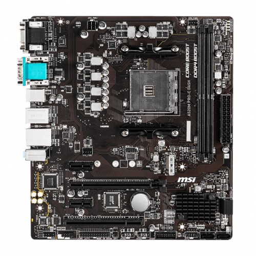 MSI A520M PRO-C DASH AMD AM4 Micro-ATX Motherboard supports AMD Ryzen 5000 & 3000 Series desktop processors and AMD Ryzen 4000 G-Series desktop processors. It supports DDR4 Memory, up to 4600(OC) MHz. It equips Realtek 8111EPV Gigabit LAN, a security network solution that combines a triple-speed IEEE 802.3 compatible Media Access Controller (MAC) with a triple-speed Ethernet transceiver and PCI Express bus controller. With state-of-the-art DSP technology and mixed-mode signal technology, the RTL8111EPV offers functions such as Crossover Detection and Auto-Correction, polarity correction, adaptive equalization, cross-talk cancellation, echo cancellation, timing recovery, and error correction are implemented to provide robust transmission and reception capability at high speeds. It supports DMTF’s client management standard for secure out-of-band and remote management. Running at PCI-E Gen3 x4 maximizes performance for NVMe based SSDs. It features M.2 Shield Frozr. Strengthened built-in M.2 thermal solution. Keeps M.2 SSDs safe while preventing throttling, making them run faster. It comes with a premium layout and digital power design to support more cores and provide better performance. Advanced technology to deliver pure data signals for the best performance and stability. It comes with a 2oz Thickened Copper PCB. An enhanced PCB design improves heat dissipation and performance reliability. Audio Boost rewards your ears with studio-grade sound quality. It features Dragon Center - A brand new software that integrates all MSI exclusive tools with a user-friendly user interface. PRO series helps users work smarter by delivering an efficient and productive experience. Featuring stable functionality and high-quality assembly, PRO series motherboards provide not only optimized professional workflows but also less troubleshooting and longevity.