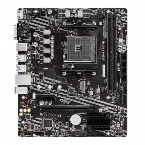 MSI A520M PRO-VH AMD AM4 Micro-ATX Motherboard supports AMD Ryzen 5000 & 3000 Series desktop processors and AMD Ryzen 4000 G-Series desktop processors. It supports DDR4 Memory, up to 4600(OC) MHz. Running at PCI-E Gen3 x4 maximizes performance for NVMe based SSDs. It features M.2 Shield Frozr. Strengthened built-in M.2 thermal solution. Keeps M.2 SSDs safe while preventing throttling, making them run faster. It comes with a premium layout and digital power design to support more cores and provide better performance. Advanced technology to deliver pure data signals for the best performance and stability. It comes with a 2oz Thickened Copper PCB. An enhanced PCB design improves heat dissipation and performance reliability. Audio Boost rewards your ears with studio-grade sound quality. It features Dragon Center - A brand new software that integrates all MSI exclusive tools with a user-friendly user interface.