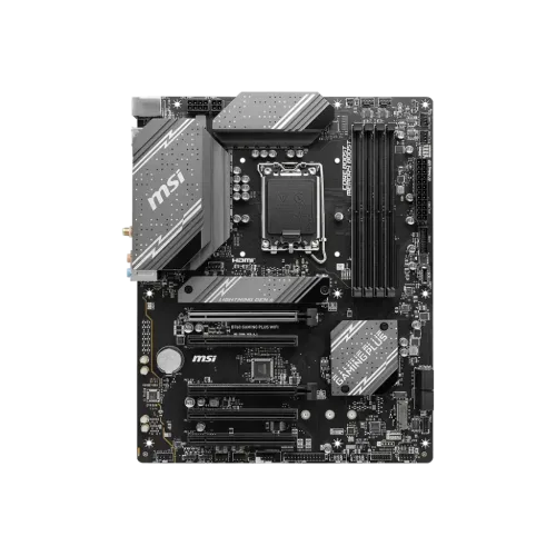 The MSI B760 GAMING PLUS WIFI ATX Motherboard is a high-performance motherboard designed for gaming enthusiasts. It supports both 14th 13th and 12th Gen Intel Core, Pentium Gold, and Celeron processors for the LGA 1700 socket, ensuring compatibility with a wide range of processors. The MSI B760 GAMING PLUS WIFI Motherboard supports DDR5 memory with a dual-channel configuration, allowing for fast and efficient data transfer at speeds of 6800+MHz (OC). It features an enhanced power design with a 12+1 Duet Rail Power System, P-PAK, and 8-pin + 4-pin CPU power connectors, ensuring stable power delivery and optimal performance. The 14th Gen Motherboard also incorporates Core Boost and Memory Boost technologies to enhance performance further. For improved thermals, the motherboard includes an extended heatsink and MOSFET thermal pads rated for 7W/mK, ensuring efficient heat dissipation. Additional choke thermal pads are also included to support high-performance systems and provide a reliable gaming experience. The MSI B760 GAMING PLUS WIFI offers lightning-fast gaming experiences with a PCIe 4.0 slot, Lightning Gen 4 x4 M.2 slot with M.2 Shield Frozr, and Turbo USB 3.2 Gen 2 10G for high-speed data transfer. It also features a 2.5G LAN with Wi-Fi 6E solution, providing upgraded network connectivity for professional and multimedia use. The high-quality PCB is constructed with a 6-layer design using 2oz thickened copper for improved durability and performance. The MSI B760 GAMING PLUS WIFI Motherboard offers Audio Boost technology, and delivers studio-grade sound quality for an immersive gaming experience.
