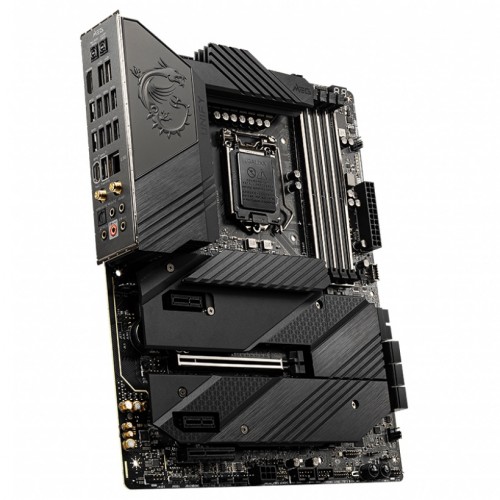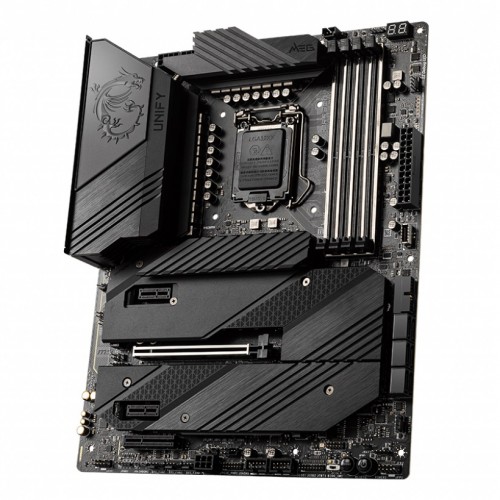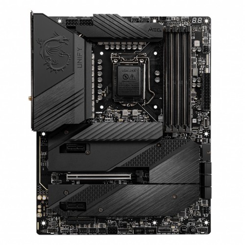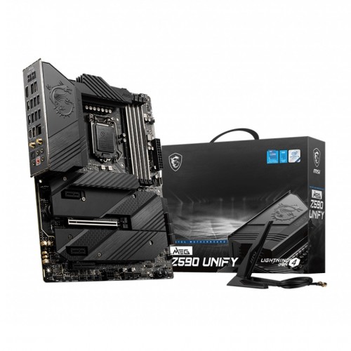 MSI MEG Z590 UNIFY 10th and 11th Gen ATX Motherboard support 11th and 10th Gen Intel Core / Pentium Celeron processors for LGA 1200 socket. It supports DDR4 Memory, up to 5600(OC) MHz. MSI MEG Z590 UNIFY 10th and 11th Gen ATX Motherboard is dedicated for Extreme OC. The top-notch R&D design and exclusive 2 DIMM solution deliver world-class memory performance. MSI MEG Z590 UNIFY 10th and 11th Gen ATX Motherboard features Quadruple M.2 Connectors. Utilizing 11th Gen Intel processors, MSI Z590 motherboards feature the latest Lightning Gen 4 M.2 which is the fastest onboard storage solution on the market with up to 64 Gb/s transfer speed. Shield Frozr design keeps M.2 SSDs safe while preventing throttling, making them run faster. MSI MEG Z590 UNIFY 10th and 11th Gen ATX Motherboard supports Extreme Power Design, INTERSIL digital PWM, 16+2+1 phases with 90A Smart Power Stage, dual CPU power connectors, and exclusive Mirrored Power Arrangement to unleash the true power of your processors. MSI MEG Z590 UNIFY 10th and 11th Gen ATX Motherboard comes with an Outstanding Cooling Solution: Aluminum Cover, VRM Heat-pipe, 7W/mK thermal pads, M.2 Shield Frozr and MOSFET Baseplate ensure extreme performance with low temp. Onboard 2.5G LAN with LAN manager and latest Wi-Fi 6E solution which supports 6GHz spectrum delivering the best online gaming experience. Lightning USB 20G: Built-in USB 3.2 Gen 2x2 port, offers 20Gbps transmission speed, 4X faster than USB 3.2 Gen 1. It has a Smart Button, One button with multiple hardware control. Reset Computer, Safe Boot, Turbo Fan, and EZ LED control functions with just one click. 8 Layer PCB with 2oz Thickened Copper: Provides higher performance and long-lasting system stability without any compromise.