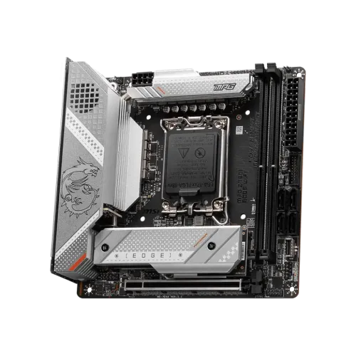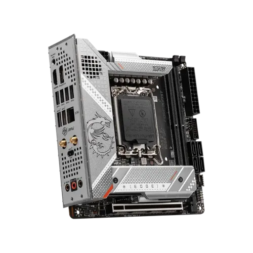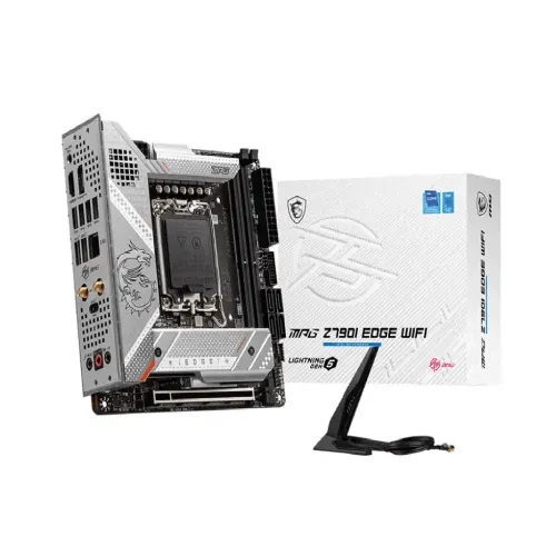 The MSI MPG Z790I EDGE WIFI Motherboard supports 13th /12th Gen Intel Core / Pentium / Celeron processors for LGA 1700 socket. The MPG series brings out fashionable products by showing extremely unique styles and expressing a conceited attitude toward the challenge of the gaming world. The motherboard comes with 2x slots that support DDR5 Memory, up to 8000+(OC) MHz. It comes with PCIe 5.0 slots, Lightning Gen 4 x4 M.2, USB 3.2 Gen 2x2. It enables RAID 0, 1, 5, and 10 through SATA or 0, 1, and 5 via M.2. GPUs and other adaptor cards may be installed through PCIe 5.0 x16, PCIe 4.0 x16, PCIe 3.0 x16, and PCIe 3.0 x1 slots. Benefit from speedy networking with a 2.5 GbE Intel LAN and Wi-Fi 6E; quickly connect to wireless peripherals with Bluetooth 5.2. It has an enlarged heatsink with a heat-pipe, MOSFET thermal pads rated for 7W/mk, additional choke thermal pads, and M.2 Shield Frozr are built for a high-performance system and non-stop gaming experience. Connect connected peripherals through two USB 2.0, two USB 3.2 Gen 1, and three USB 3.2 Gen 2x2 Type-A ports, or a USB 3.2 Gen 2x2 Type-C port. DisplayPort and HDMI are used to output video. A Flash BIOS button is also located on the rear I/O panel, and internal headers support front-panel USB 3.2 Gen 2 Type-C and USB 3.2 Gen 1 and 2.0 Type-A ports, RGB connections, chassis intrusion, a TPM module, and other features. The MSI MPG Z790I EDGE WIFI Motherboard comes with a 03-year warranty.