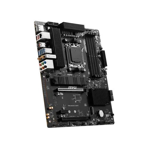 The MSI PRO B650-S WIFI DDR5 AM5 ATX Motherboard is a powerhouse built to handle AMD Ryzen 7000 Series Desktop Processors, providing compatibility with the most recent and powerful CPUs on the market. DDR5 memory compatibility, providing high-speed data transmission with dual-channel DDR5 7200+MHz (OC), is one of its cutting-edge characteristics. With a 12+2 Duet Rail Power System, two 8-pin CPU power connections, Core Boost, and Memory Boost, the Motherboard has an upgraded power architecture that ensures reliable and efficient power supply for best performance. Its premium thermal solution includes 7W/mK MOSFET thermal pads and M.2 Shield Frozr, resulting in a high-performance system with efficient heat dissipation. The motherboard's high-quality 6-layer PCB, constructed of 2oz thicker copper, improves longevity and stability, laying the groundwork for heavy workloads. The MSI PRO B650-S WIFI Motherboard has PCIe 4.0 slots, Lightning Gen 4 x4 M.2 with M.2 Shield Frozr, and USB 3.2 Gen 2x2 connections to meet the needs of current gaming and data-intensive applications. The motherboard provides an improved network solution with 2.5G LAN and Wi-Fi 6E, giving a secure, reliable, and fast network connection suited for both professional and multimedia applications. The introduction of AUDIO BOOST offers a greater gaming experience with studio-grade sound quality, boosting total immersion for players. In conclusion, the MSI PRO B650-S WIFI DDR5 AM5 ATX Motherboard is a feature-rich option that delivers a strong, dependable foundation for gamers and professionals looking for top-tier performance and functionality.