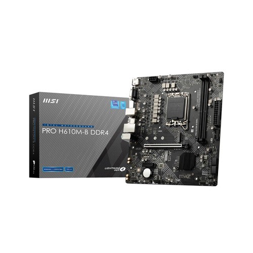 The MSI PRO H610M-B DDR4 LGA 1700 Micro-ATX 12th Gen Motherboard is a feature-rich and reliable motherboard designed to support the latest 12th generation Intel Core processors with the LGA 1700 socket. This micro-ATX motherboard is ideal for building a powerful and efficient system for various computing needs, including gaming, content creation, and everyday productivity.One of the standout features of this motherboard is its comprehensive audio support. With 7.1-channel high-definition audio, users can enjoy immersive and crystal-clear sound for their favorite games, movies, and music. This ensures an excellent audio experience, whether using headphones or a speaker setup.The motherboard is powered by the Intel H610 chipset, which provides a stable and efficient foundation for your system. It supports up to 64GB of DDR4 memory across two 288-pin DIMM slots, offering ample memory capacity and dual-channel architecture for enhanced performance during multitasking and memory-intensive applications. With support for memory speeds ranging from 2133MHz to 3200MHz, it allows users to take advantage of faster memory modules for improved system responsiveness.On the graphics front, the motherboard features one HDMI 2.1 port with HDR support, capable of driving a maximum resolution of 4K at 60Hz. Additionally, there's a VGA port that supports resolutions up to 2048x1536 50Hz, making it compatible with older display devices. The HDMI port is particularly beneficial for users seeking to connect to high-definition displays and enjoy smooth visuals while gaming or watching high-quality content.For networking, the motherboard includes a reliable Intel I219V 1Gbps LAN controller, providing stable and fast Ethernet connectivity for online activities and local network transfers.Storage options on the MSI PRO H610M-B are plentiful. It offers four SATA 6Gb/s ports from the Z690 chipset and two M.2 slots with support for PCIe 4.0 x4 and various storage devices, including NVMe SSDs and SATA-based storage. The motherboard also supports Intel Optane Memory and RAID configurations for added data redundancy and performance.Gamers and content creators will appreciate the multi-GPU support for AMD CrossFire™ Technology, allowing them to install multiple AMD graphics cards and enjoy improved graphics performance in compatible applications.On the connectivity front, the motherboard offers a total of four USB 3.2 Gen 1 5Gbps ports (two Type-A ports on the back panel and two available through an internal USB connector) and six USB 2.0 ports (four Type-A ports on the back panel and two available through an internal USB 2.0 connector), allowing for easy connection of peripherals and accessories.With its micro-ATX form factor, this motherboard is suitable for compact PC builds without compromising on essential features. MSI provides a 3-year warranty, demonstrating their commitment to quality and reliability.