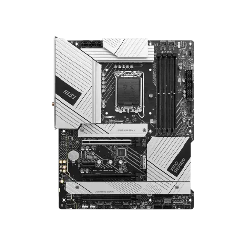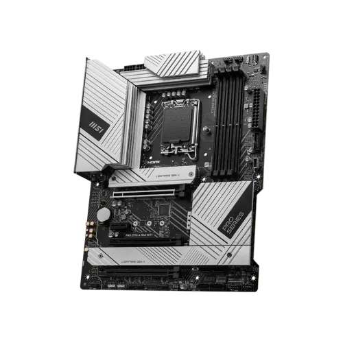 The MSI PRO Z790-A MAX WIFI DDR5 ATX Motherboard is a high-performance motherboard designed to meet current computer and gaming demands. It is designed to handle Intel Core 14th, 13th, and 12th Generation CPUs, as well as Intel Pentium Gold and Celeron processors, and it makes use of the LGA 1700 socket for broad processor compatibility. Its compatibility for DDR5 memory, which operates at Dual Channel DDR5 speeds of 7800+MHz (when overclocked), ensures fast data access and better multitasking. The Motherboard delivers superior power delivery and efficiency because of its 16+1+1 digital power system, 80A smart power stages, twin 8-pin CPU power connections, Core Boost, and Memory Boost technologies. It also excels in thermal management with an extended heatsink, MOSFET thermal pads, choke thermal pads, and M.2 Shield Frozr, all contributing to sustained high performance during extended gaming sessions. Durability and dependability are ensured by a high-quality 6-layer PCB composed of 2oz thicker copper and server-grade components. PCIe 5.0 slots, Lightning Gen 4 x4 M.2, and USB 3.2 Gen 2x2 connectors provide lightning-fast connection. Intel Turbo USB 3.2 Gen 2 provides robust and fast USB communication. The 2.5G LAN with Wi-Fi 7 Solution provides professional and multimedia users with enhanced networking capabilities, enabling safe, stable, and fast network connections. Finally, AUDIO BOOST 5 pampers your ears with studio-grade sound quality, giving an immersive gaming experience with remarkable audio clarity and fidelity. The MSI PRO Z790-A MAX WIFI DDR5 ATX Motherboard is an excellent choice for gamers and content makers seeking top-tier performance and connection on a single board.