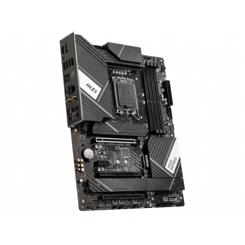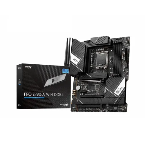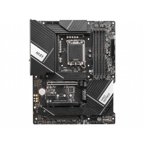 The MSI PRO Z790-A WIFI DDR4 ATX Motherboard supports LGA 1700 CPUs from the 12th/13th generation Intel Core, Pentium Gold, and Celeron families. This ATX motherboard, which uses the Intel Z790 chipset and the LGA 1700 socket, has four DDR4 RAM slots that allow twin-channel memory and speeds up to 5333 MHz when overclocked. Six SATA III connections and four M.2 interfaces give abundant storage space and enable RAID 0, 1, 5, and 10 through SATA or 0, 1, and 5 via M.2. GPUs and other adaptor cards may be installed through PCIe 5.0 x16, PCIe 4.0 x16, PCIe 3.0 x16, and PCIe 3.0 x1 slots. Benefit from speedy networking with a 2.5 GbE Intel LAN and Wi-Fi 6E; quickly connect to wireless peripherals with Bluetooth 5.2. The Realtek ALC4080 audio codec offers 7.1 channel surround sound, and the rear ports can be used for analog or digital output. Connect connected peripherals through two USB 2.0, two USB 3.2 Gen 1, and three USB 3.2 Gen 2x2 Type-A ports, or a USB 3.2 Gen 2x2 Type-C port. DisplayPort and HDMI are used to output video. A Flash BIOS button is also located on the rear I/O panel, and internal headers support front-panel USB 3.2 Gen 2 Type-C and USB 3.2 Gen 1 and 2.0 Type-A ports, RGB connections, chassis intrusion, a TPM module, and other features. The MSI PRO Z790-A WIFI DDR4 13th Gen ATX Motherboard comes with a 03-year warranty.