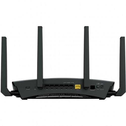 The Netgear R9000 WIRELESS AD7200 Mbps Tri-Band Quad-Stream Nighthawk X10 GIGABIT Router is a high-performance home networking solution designed to provide reliable, high-speed connectivity to all of your devices. With a total data rate of 7200Mbps, this router is capable of delivering ultra-fast internet speeds and reliable connections, making it ideal for streaming high-definition video, gaming, and other bandwidth-intensive applications.The Netgear R9000 comes equipped with seven Gigabit Ethernet ports, one WAN and six LAN, and two USB 3.0 ports, making it easy to connect all of your wired devices, such as desktop computers, gaming consoles, and media servers. Additionally, the router supports dual Gigabit Ethernet port aggregation, allowing you to combine the bandwidth of two Ethernet ports for even faster wired speeds.The Netgear R9000 also features advanced wireless standards, including 802.11ac and 802.11ad, providing you with powerful tri-band wireless connectivity. Band 1 operates at 2.4GHz and offers a data rate of 800Mbps, while band 2 operates at 5GHz and delivers a data rate of 1733Mbps. Band 3 operates at 60GHz and provides a whopping data rate of 4600Mbps, which is perfect for high-bandwidth applications like 4K video streaming and virtual reality.