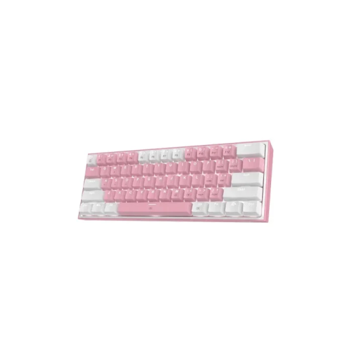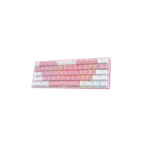 The Redragon K617 Fizz RGB in Pink-White is a stylish and compact 60% mechanical gaming keyboard designed for gamers who appreciate both aesthetics and performance. This keyboard features a vibrant pink and white color scheme, making it an eye-catching addition to any gaming setup. Its small form factor, with just 61 keys, is perfect for those who want a space-saving design without sacrificing essential functionality.The K617 Fizz is equipped with Red switches, which are known for their smooth, linear keystrokes. These switches provide a quiet and swift typing experience, ideal for gamers who prefer fast and responsive keypresses without the tactile bump or audible click found in other switch types. The low actuation force of the Red switches allows for quicker keypresses, which can be advantageous in competitive gaming scenarios. This keyboard also boasts customizable RGB backlighting, offering a range of vibrant lighting effects to suit your mood or gaming environment. The backlighting enhances the overall gaming experience, especially in low-light conditions, and the colors pop beautifully against the pink and white keycaps. Built with durability in mind, the K617 Fizz features anti-ghosting and N-key rollover, ensuring that every keypress is registered accurately, even when multiple keys are pressed simultaneously. Despite its compact size, this keyboard is robust and capable of withstanding the rigors of intense gaming sessions. In summary, the Redragon K617 Fizz RGB in Pink-White is an excellent choice for gamers seeking a compact, aesthetically pleasing mechanical keyboard that doesn’t compromise on performance. With its smooth Red switches, vibrant RGB lighting, and durable build, it’s a perfect blend of form and function.