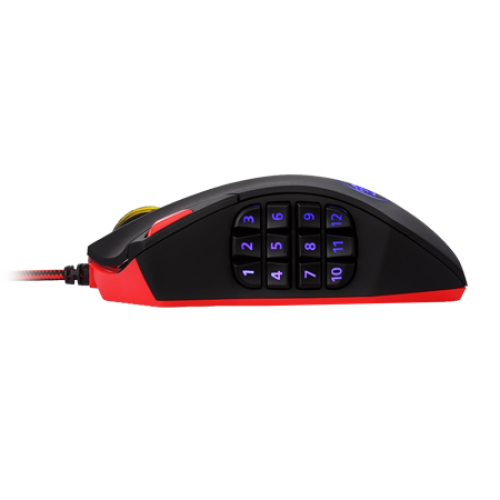The Redragon M901 Mouse features 6 Standard Mouse Buttons PLUS 12 MMO programmable side buttons. Total 18 buttons. Power button, Pulsing Breathing light color modes. Durable smooth TEFLON feet pads for ultimate gaming control.The Mouse works great with Redragon Gaming keyboards. Comes with 6 foot, 3mm strong high-speed braided fibre cable and a gold-plated corrosion free USB connector for a reliable connection.